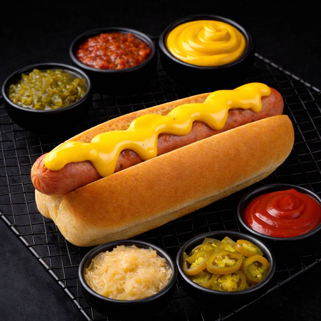 Delicioso hot dog con salchicha Dogger rellena de queso. Adiciones y toppings de tu elección.