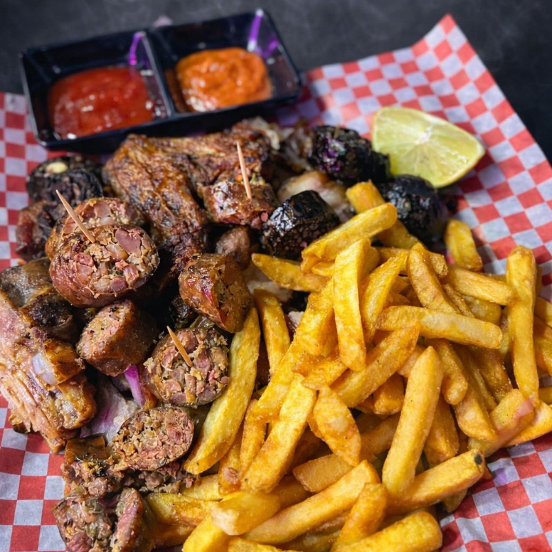 El mix ideal, morcilla, chorizo y chicharrón acompañados de bollo y nuestras salsas artesanales.