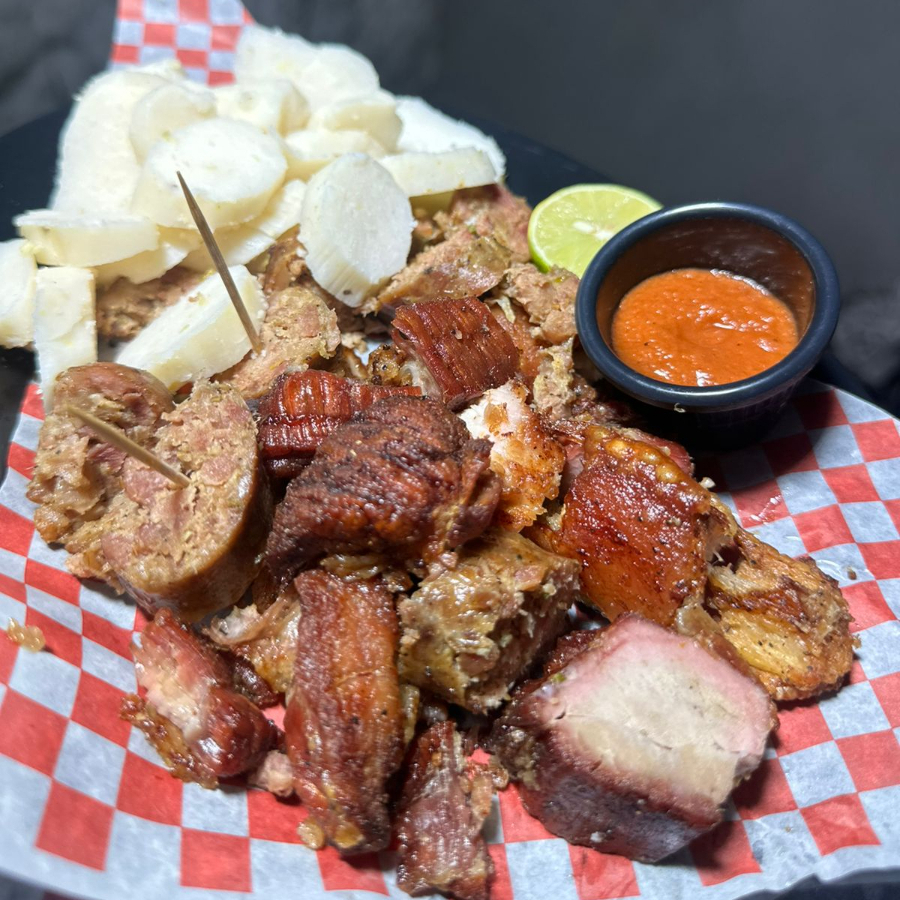 Banquete de bondiola de cerdo, chorizo y chicharrón, acompañados de bollo y variedad de salsas.