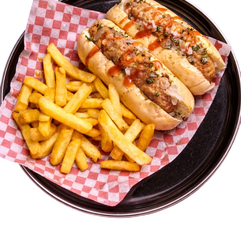 Dos deliciosos choripanes artesanales acompañados de una generosa porción de papas a la francesa.