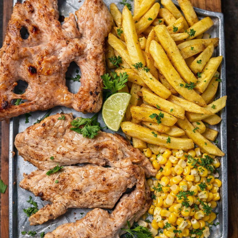 300 g De pechuga de pollo a la plancha, acompañada de papas (francesa o casco) y ensalada fresca de la casa.