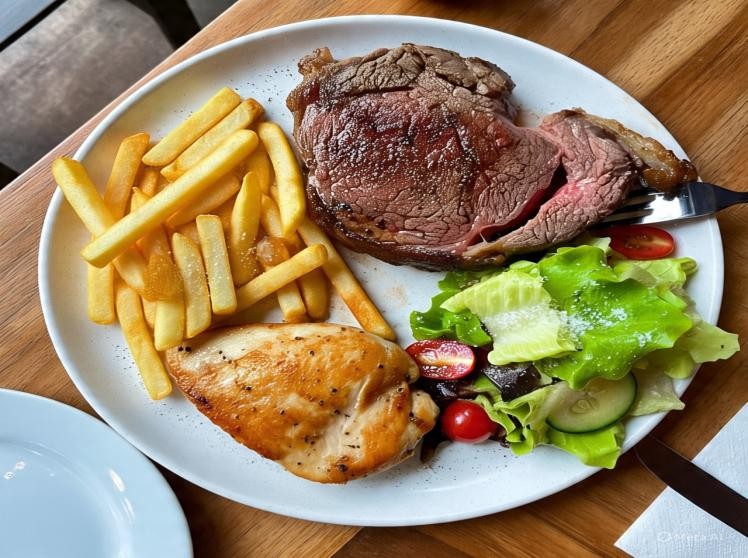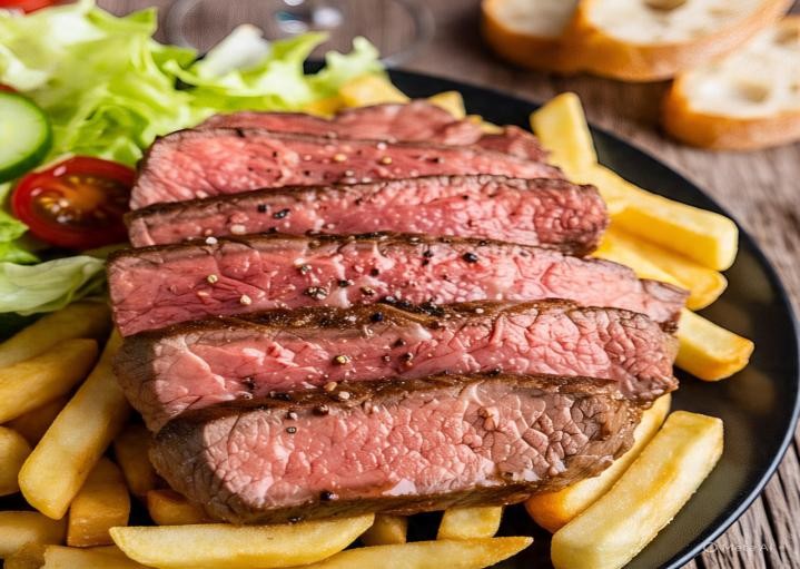 Delicioso Trozo de carne hecho al grill, acompañada de nuestra salsa tibetana en base a champiñones y crema de leche ensalada fresca y papas a la francesa en chimichurri argentino.