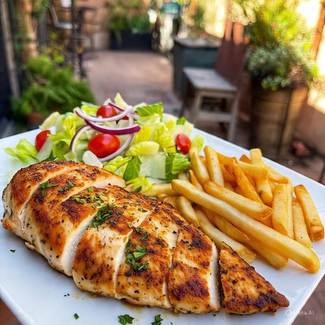 pechuga de pollo hecha al grill, bañada en delicioso chimichurri argentino, papas a la francesa y ensalada fresca de lechuga, tomate, cebolla y maíz.