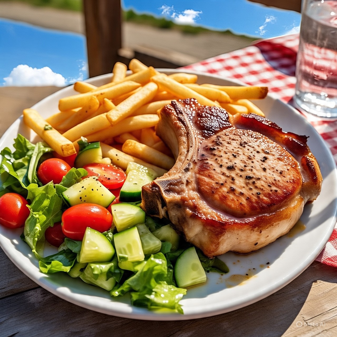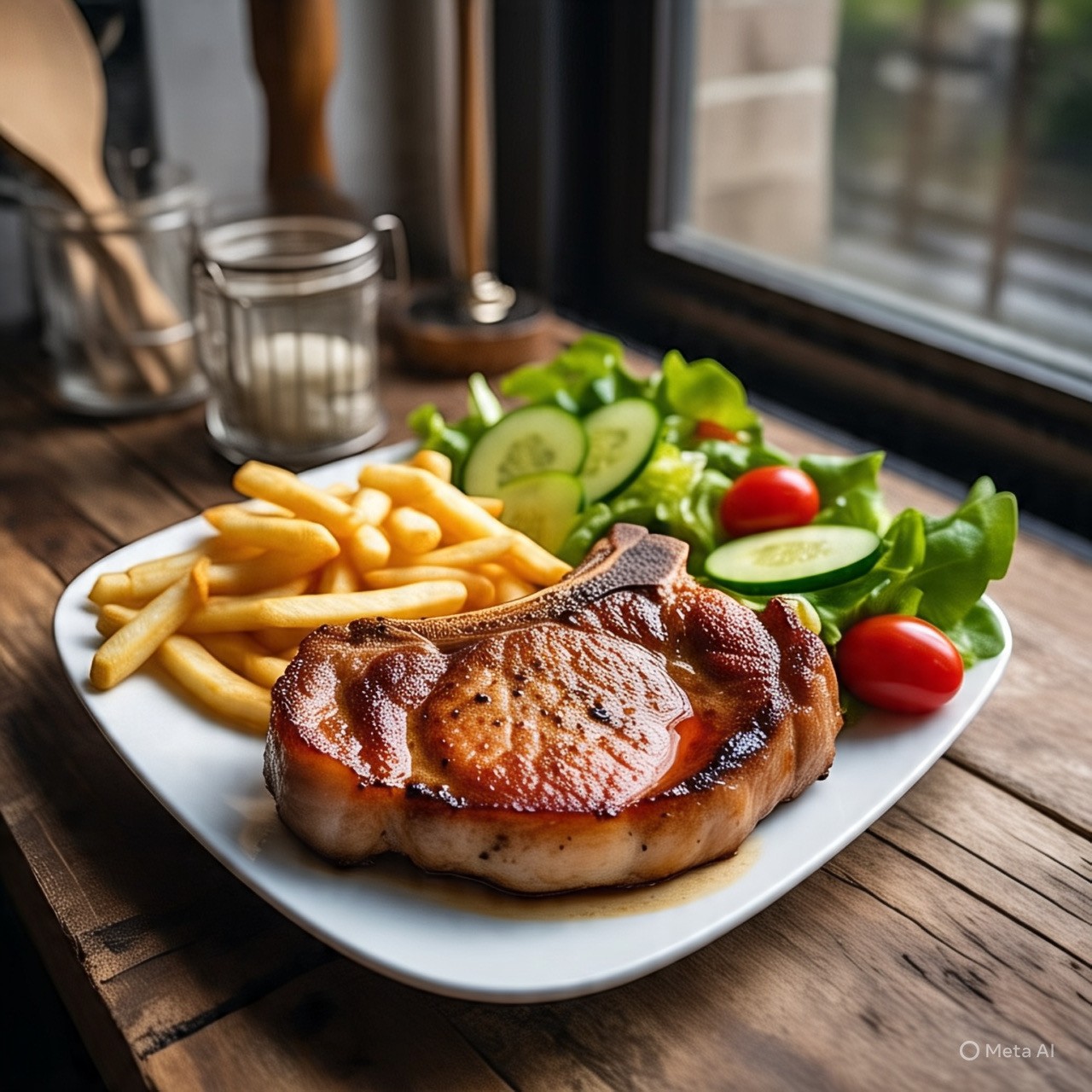 Pulpa de cerdo, bañada en delicioso chimichurri argentino, papas a la francesa y ensalada fresca de lechuga, tomate, cebolla y maíz.