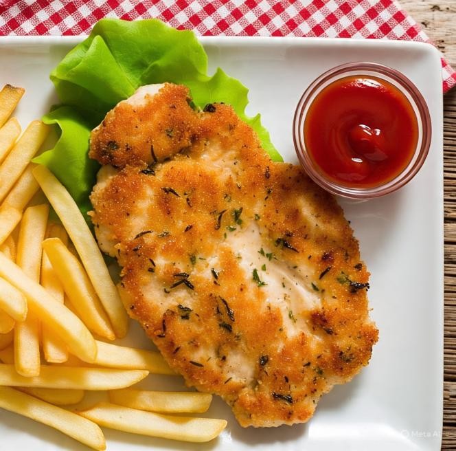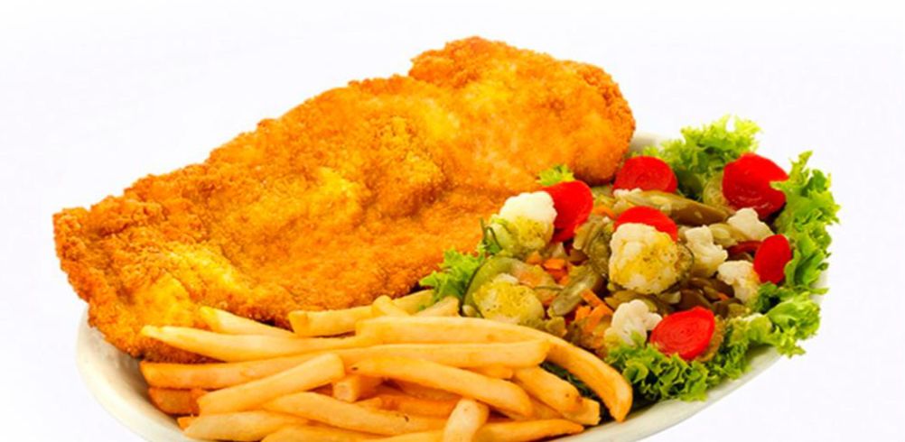Filete de pechuga, frito y apañado, acompañado de papas francesas, y ensalada fresca.