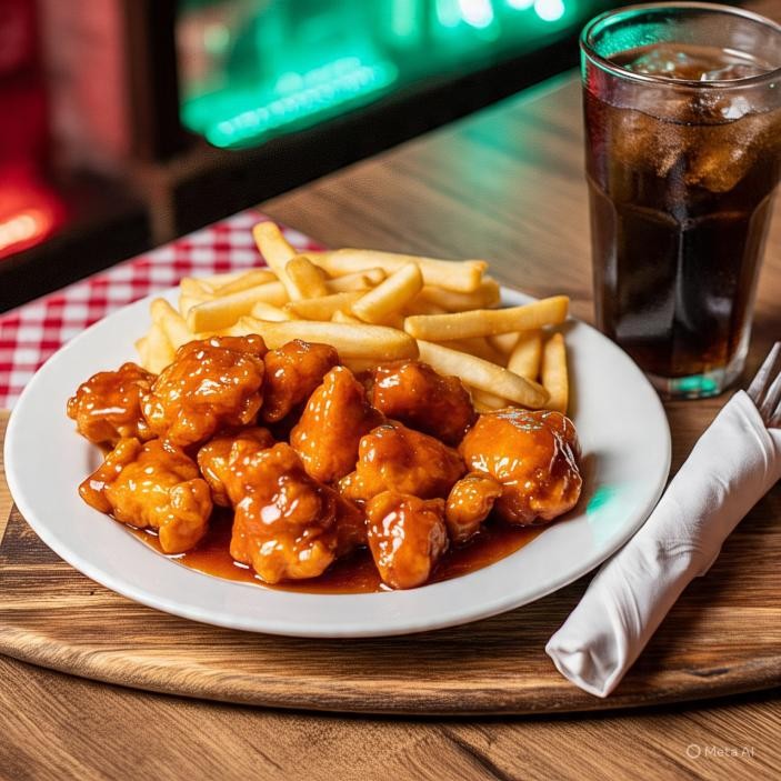 pechuga de pollo troceada hecha al grill frita y apanada, bañada en deliciosa salsa agridulce tailandesa, papas a la francesa y ensalada fresca de lechuga, tomate, cebolla y maíz.