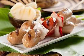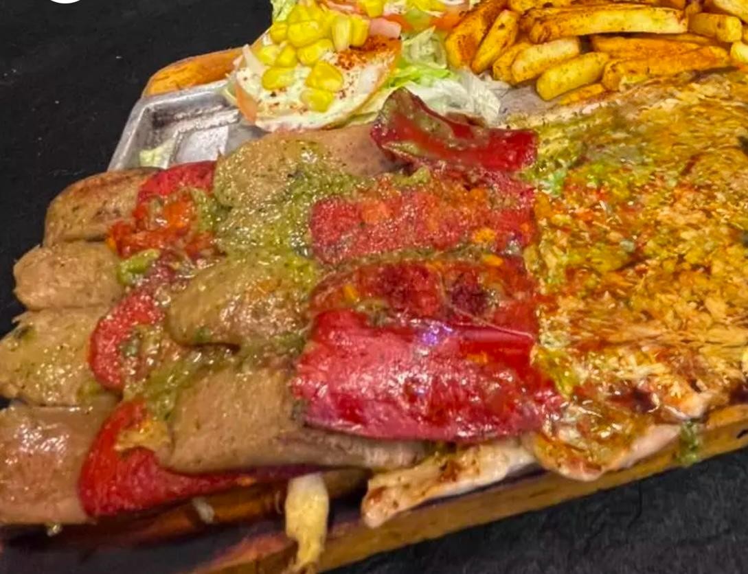Chorizo y butifarras en palitos, acompañados de cebolla y pimentón, bañados en delicioso chimichurri argentino, papas a la francesa y ensalada fresca de lechuga, tomate, cebolla y maíz.