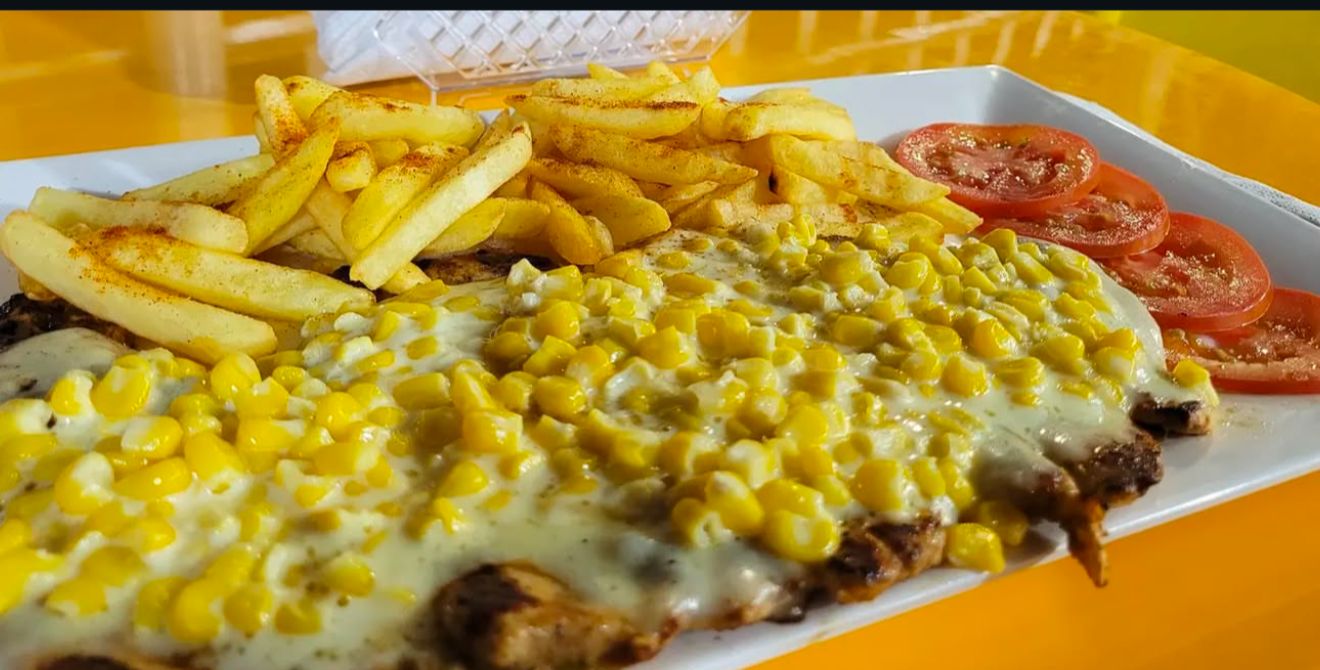 Carne y pechuga de pollo, bañadas en delicioso chimichurri argentino, papas a la francesa y ensalada fresca de lechuga, tomate, cebolla y maíz.