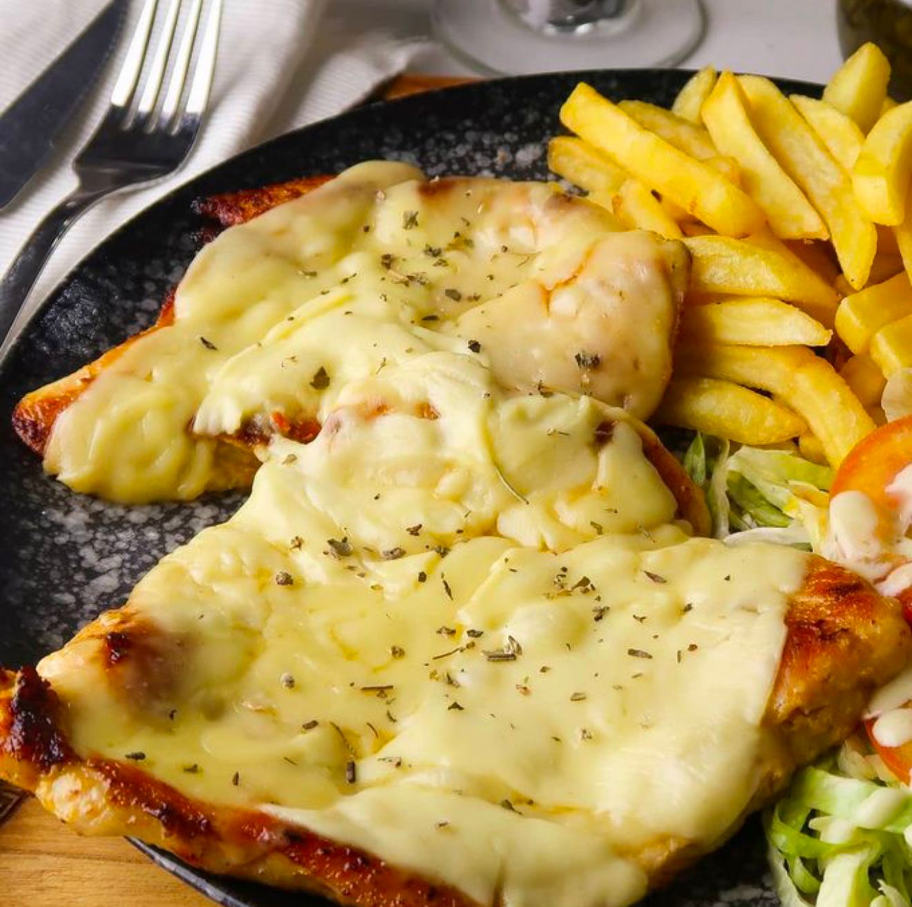 Deliciosa pechuga de pollo frita y apanada bañadas en queso mozarella gratinado ensalada fresca y papas a la francesa en chimichurri argentino.