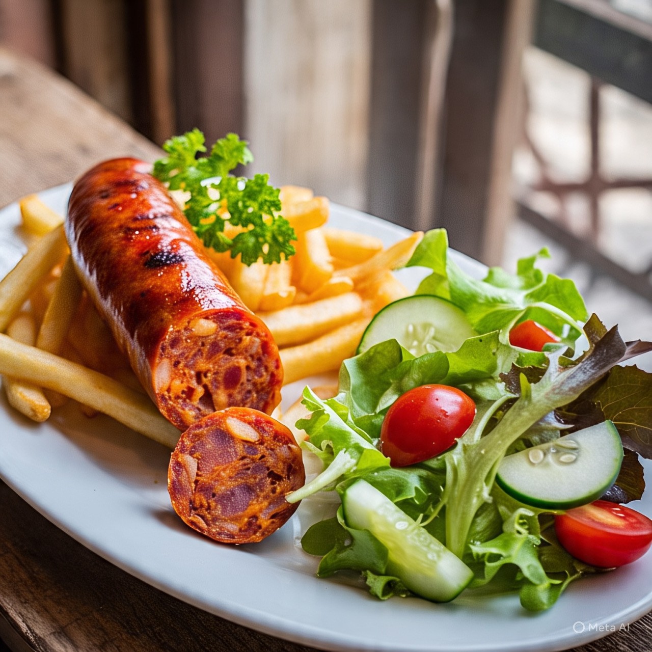 1 ud De chorizo de cerdo, bañado en delicioso chimichurri argentino, papas a la francesa y ensalada fresca de lechuga, tomate, cebolla y maíz.