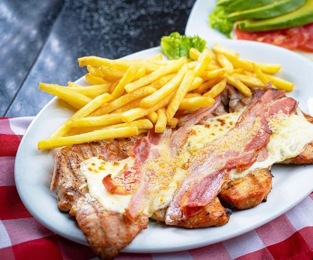 Deliciosa pechuga de pollo hecha al grill, acompañada de queso mozzarella gratinado, tocineta tostada ensalada fresca y papas a la francesa en chimichurri argentino.