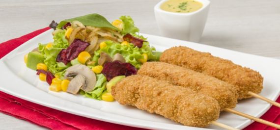 Delicioso pincho de pechuga de pollo frito y apanado, acompañado de papas y ensalada fresca.