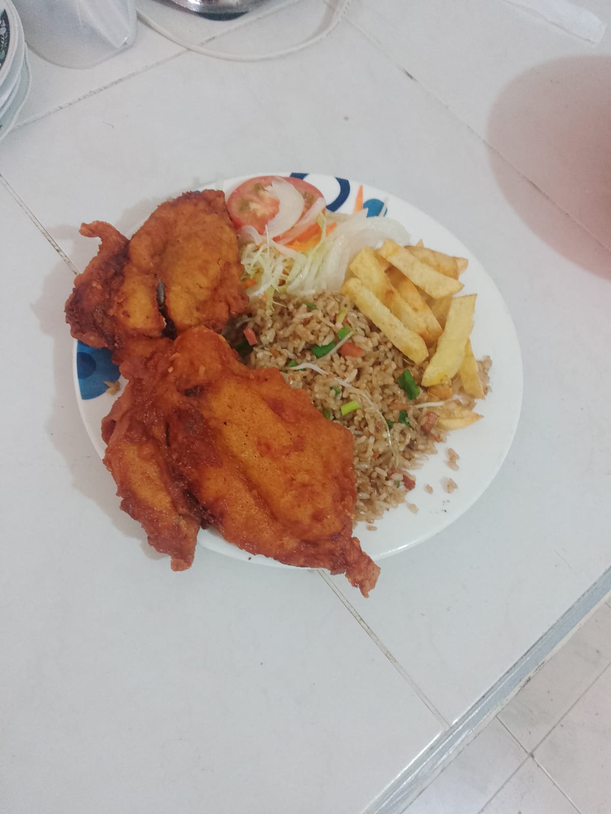 bagre frito acompañado de arroz con coco, ensalada y patacon