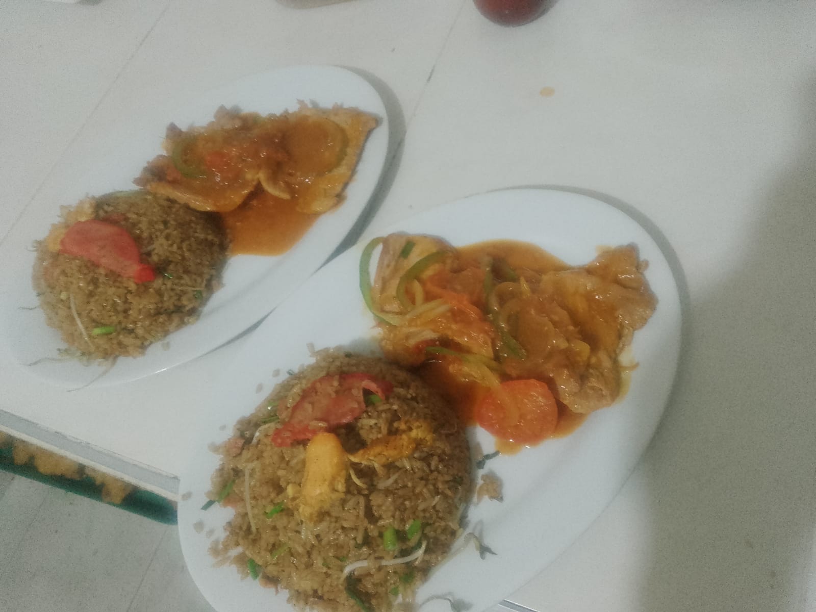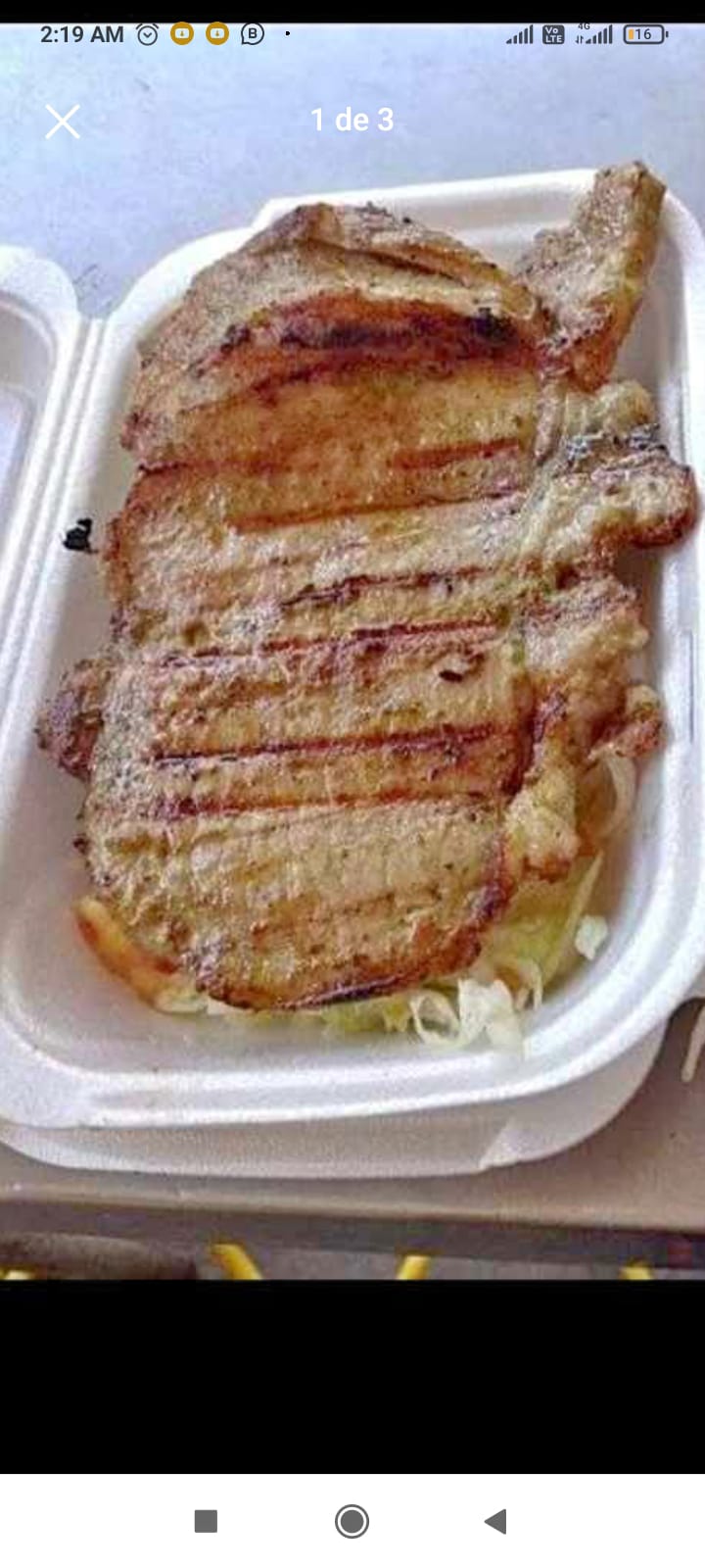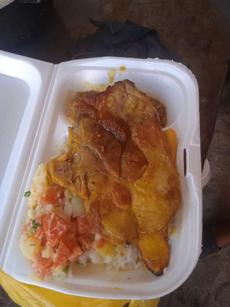 Chuleta en salsa bbq acompañado de principio, ensalada, arroz y patacon