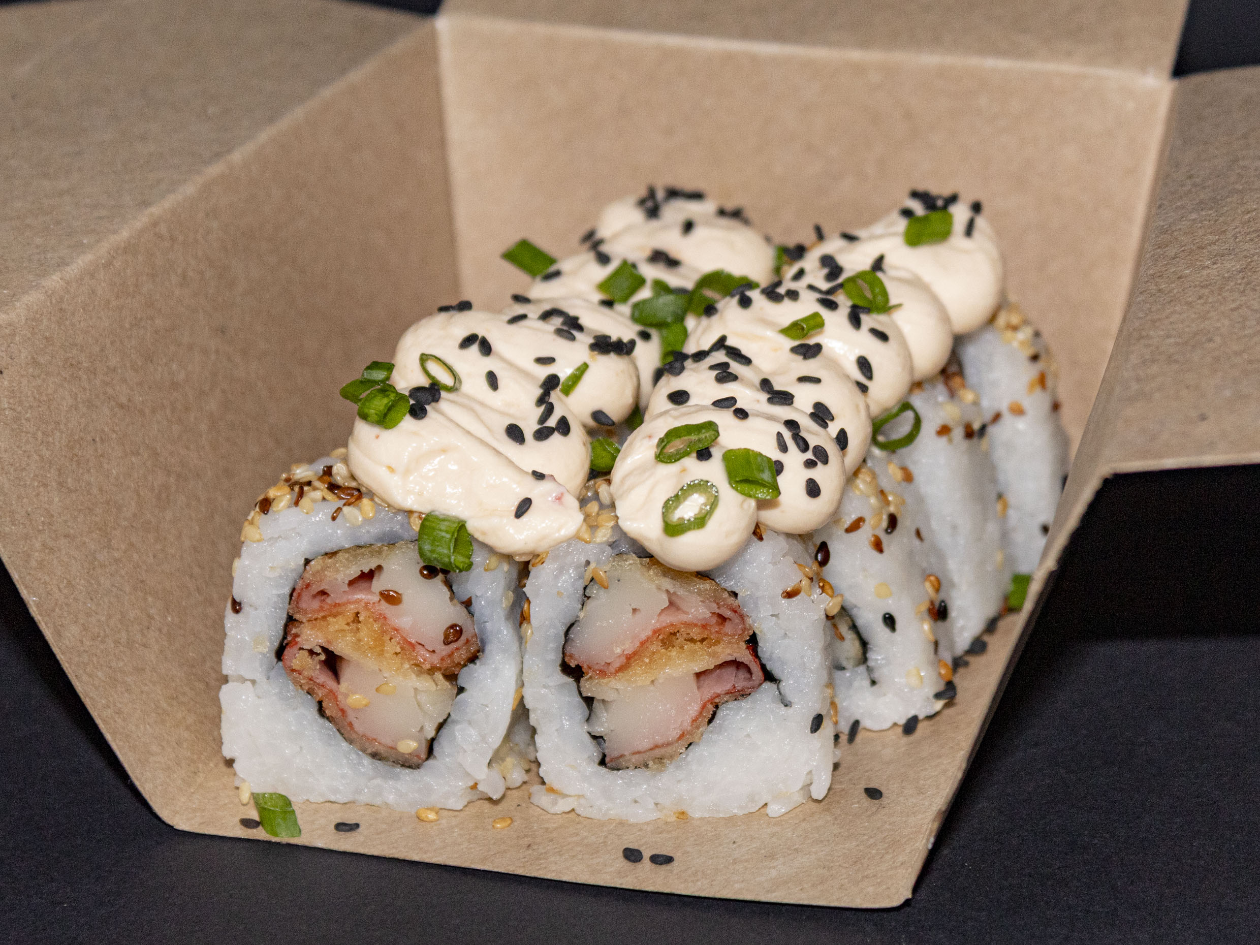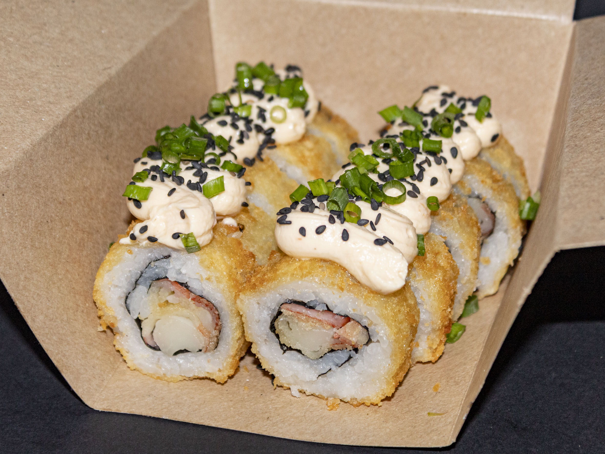 12 Bocados de sushi apanado relleno de pescado blanco, queso crema, aguacate soya