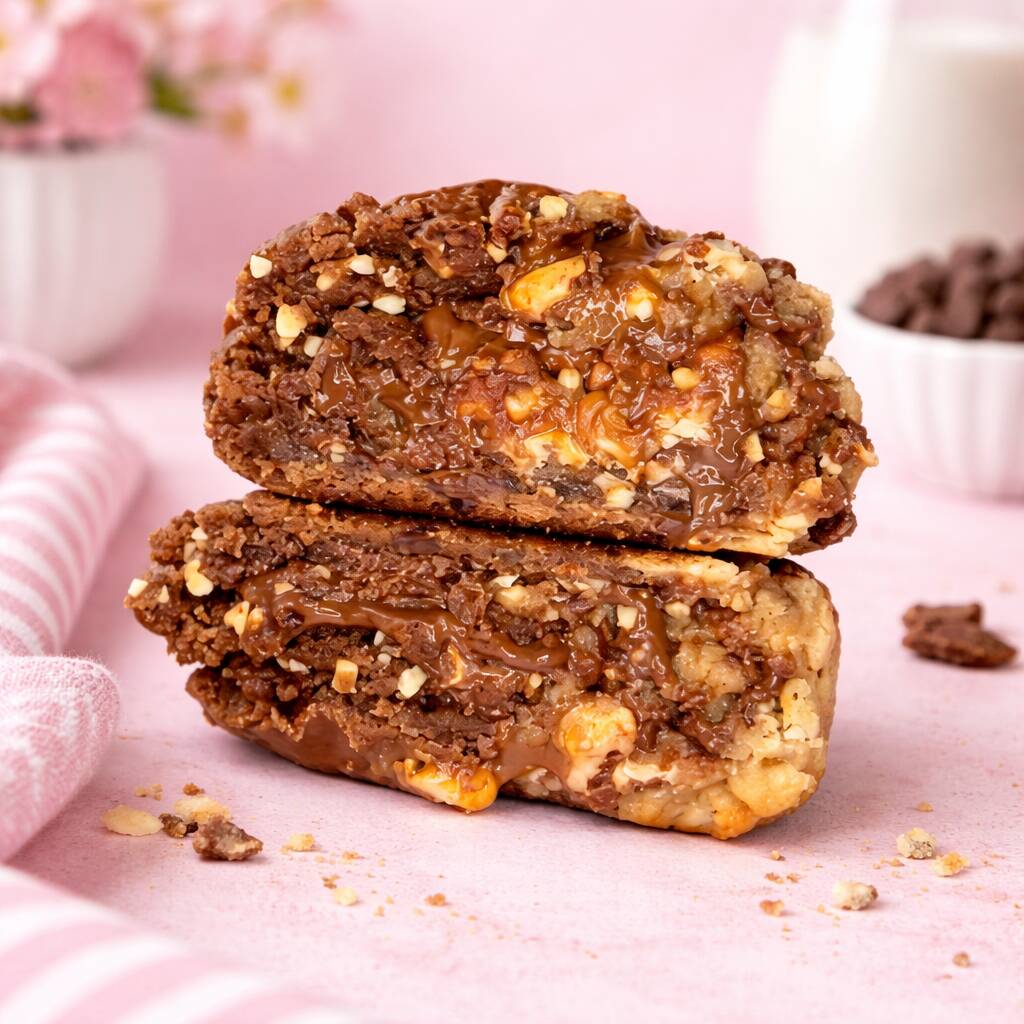 Galleta de chocolate con maní y chips negros, rellena de Ferrero rocher y Nutella