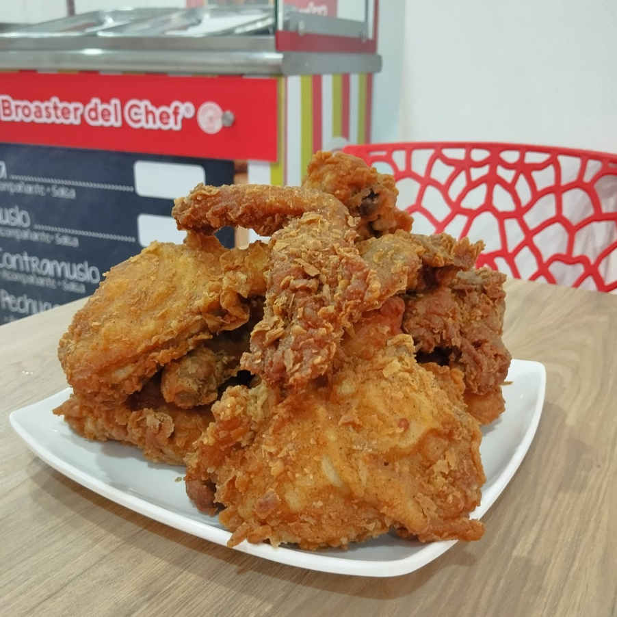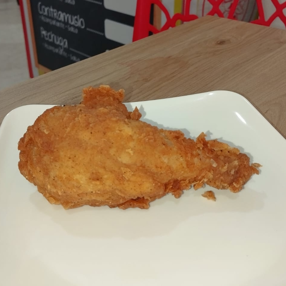 Porción individual de muslo de pollo broaster. ¡Jugoso por dentro!.