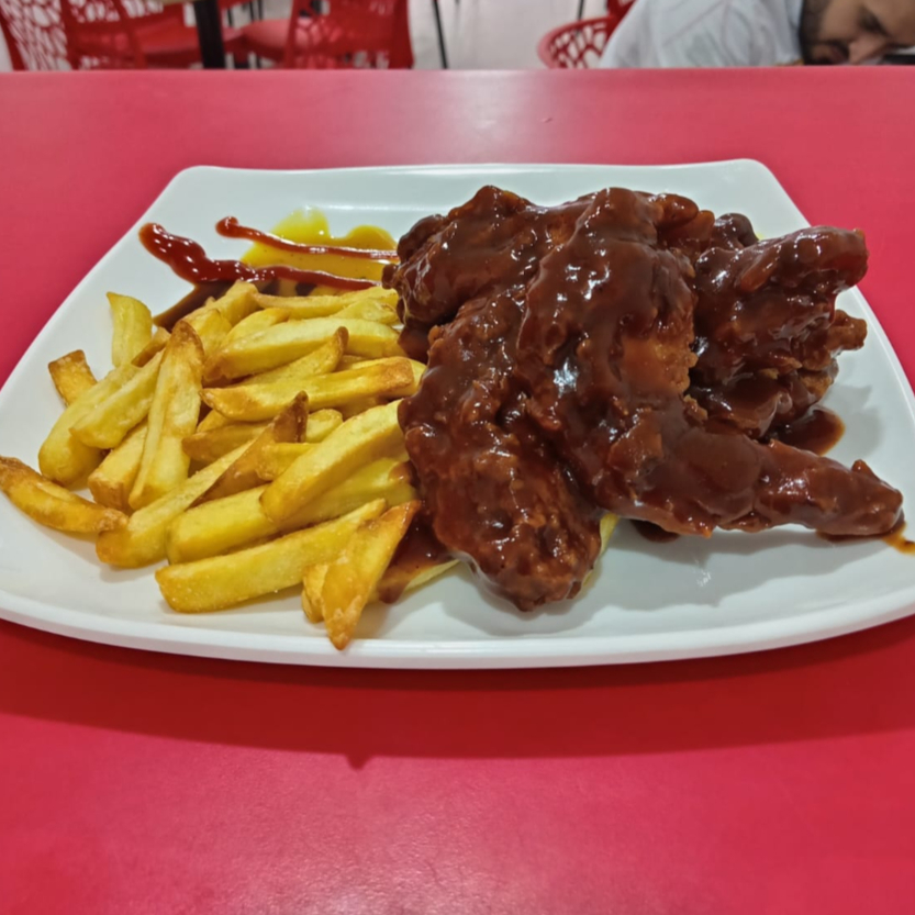 8 Alitas de pollo bañadas en nuestra salsa BBQ, acompañadas de crujientes papas fritas y un refrescante vaso de gaseosa. ¡Perfectas para compartir!.