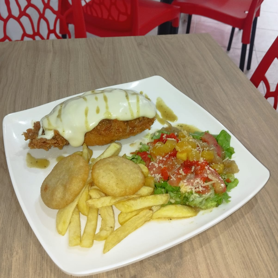 Pechuga gratinada de pollo. Incluye papas fritas, arepa, ensalada (tomate, cebolla y lechuga), y un vaso de gaseosa. ¡Doble sabor y cremosidad!.