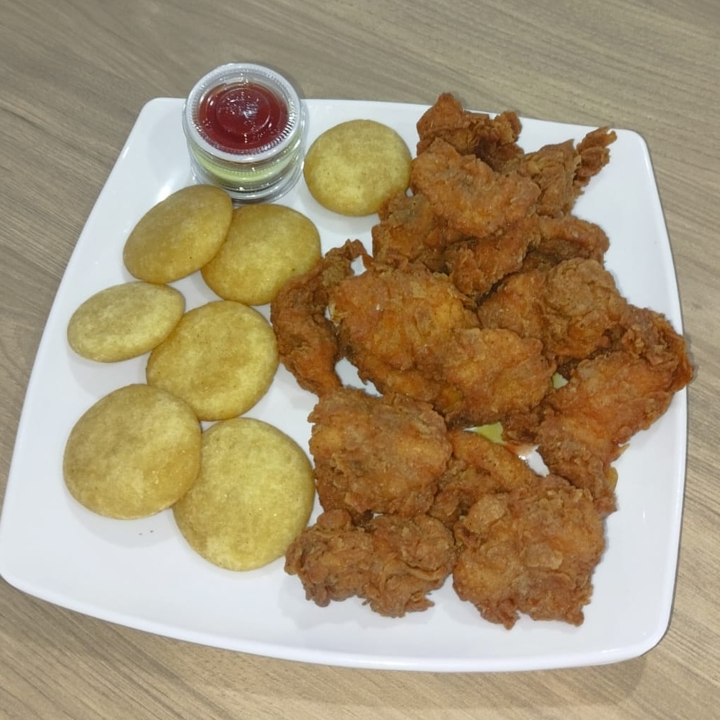 Porción de nuggets de pollo, acompañados de papas fritas, arepa y ensalada fresca (tomate, cebolla y lechuga). ¡El clásico que siempre encanta!.