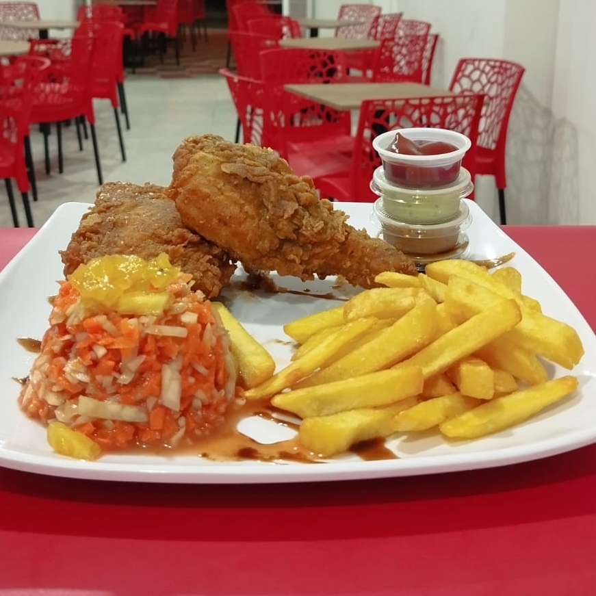 2 Presas de pollo broaster. Viene con papas fritas, ensalada (tomate, cebolla y lechuga), y arepa. ¡Ideal para un apetito mediano!.