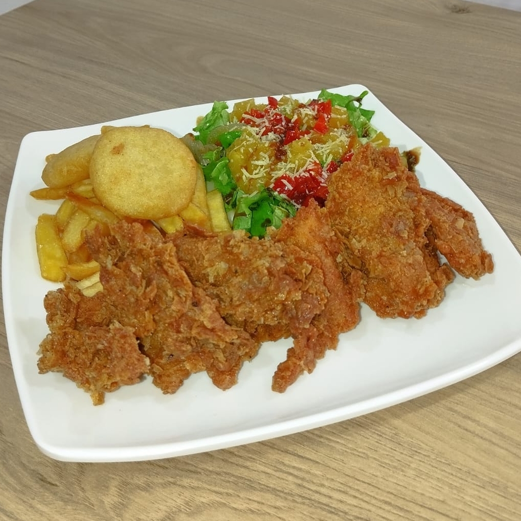 Tiras de pollo broaster crujiente (Trocipollo), servidas con papas fritas, arepa y ensalada fresca (tomate, cebolla y lechuga). ¡Un bocado irresistible!.