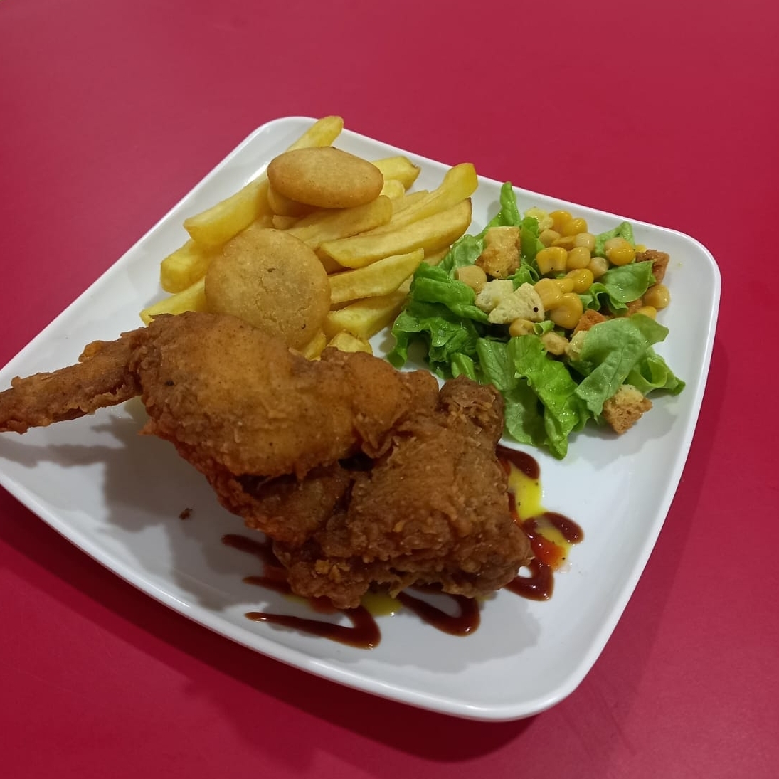 1 Presa de pollo broaster (contramuslo) acompañada de papas fritas, ensalada (tomate, cebolla y lechuga), y arepa.