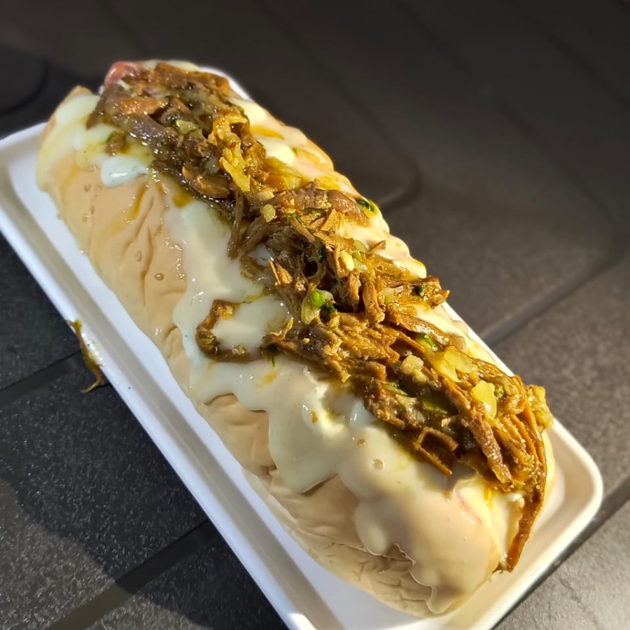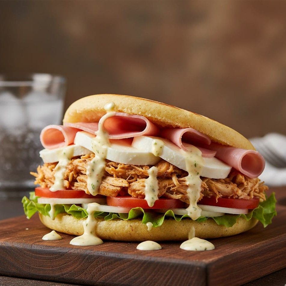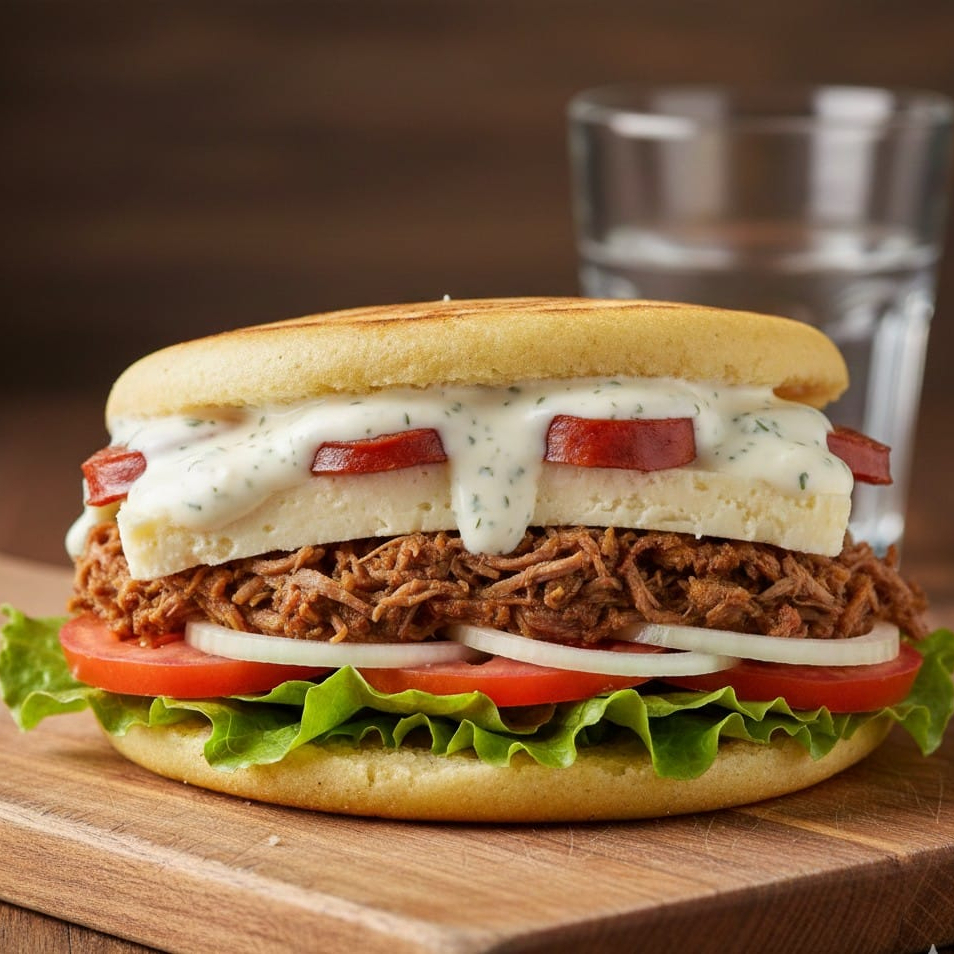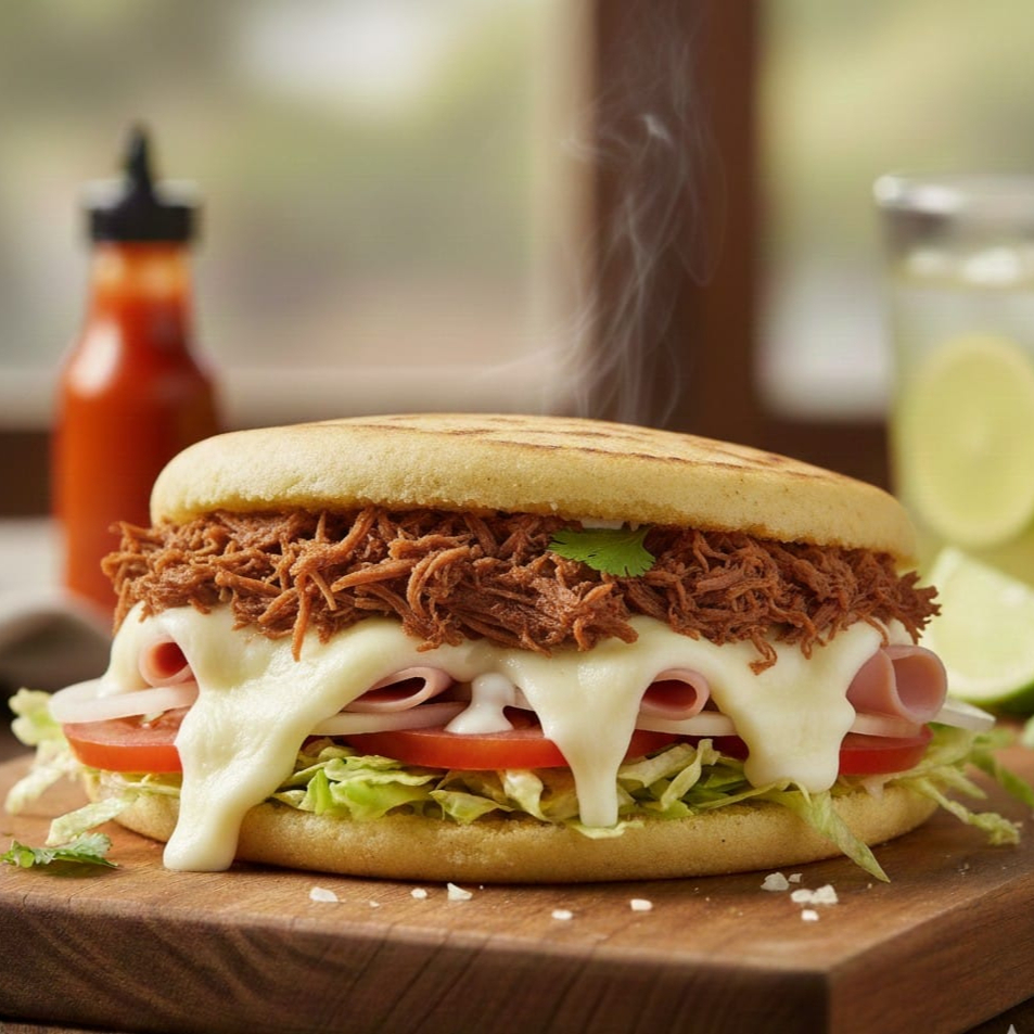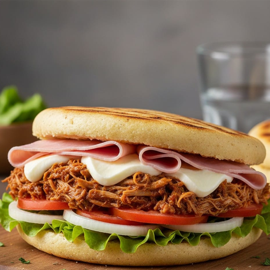 Arepa asada; Carne de cerdo esmechada, queso mozzarella, jamón, tomate, cebolla, lechuga, salsa tártara, salsa tomate