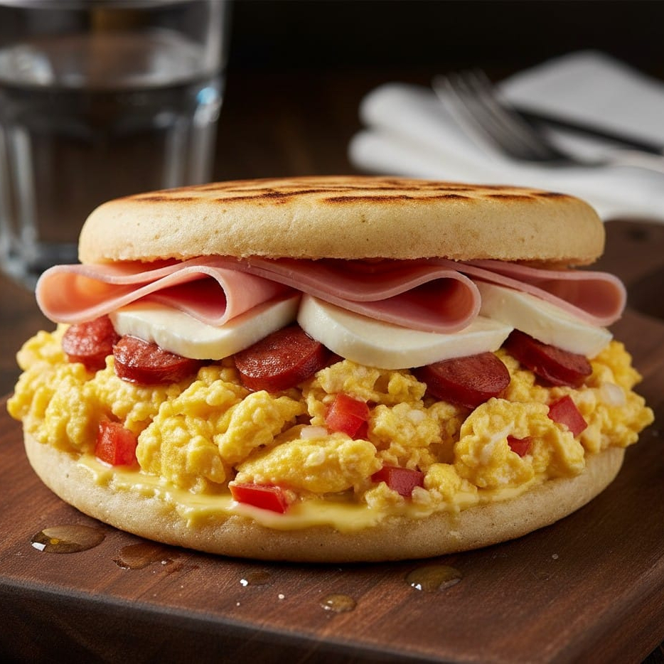 Arepa asada; Huevo revuelto con salchicha y tomate y cebolla queso mozzarella, jamón, mantequilla