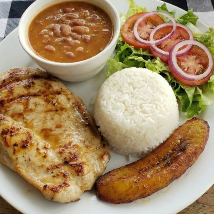 Pechuga asada acompañada de arroz blanco granos ensalada tajada maduramadura jugo del día