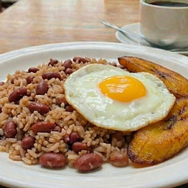 Arroz calentado con saragosa huevo frito y tajada maduro