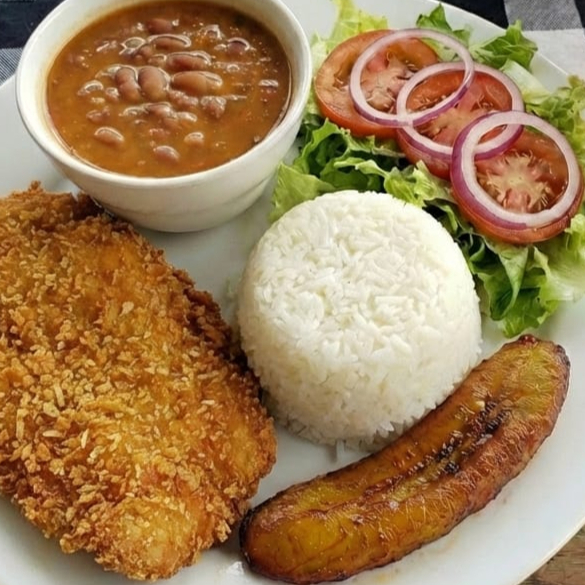 Pechuga crispy acompañada de arroz blanco granos ensalada tajada