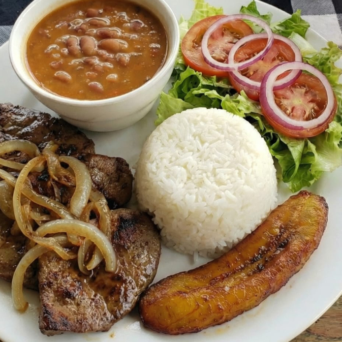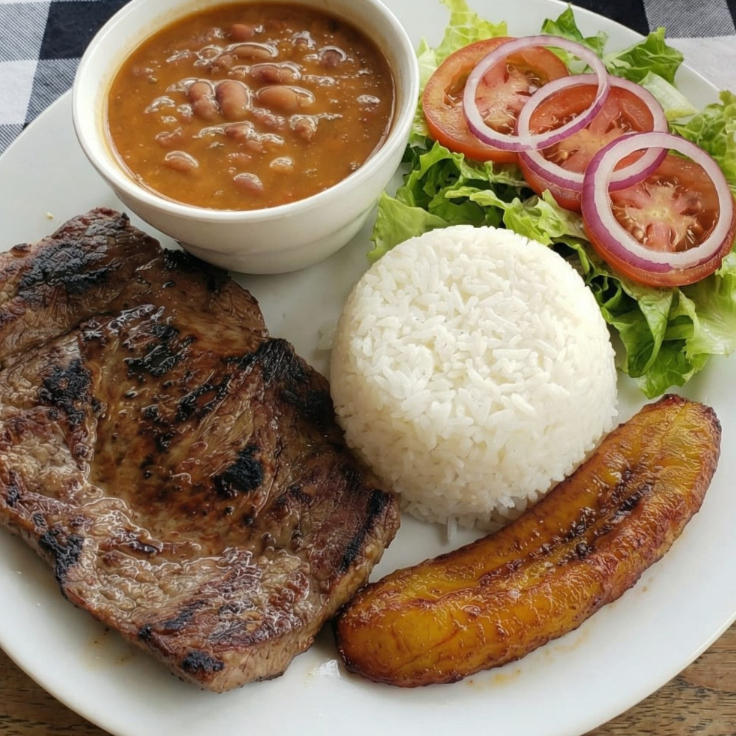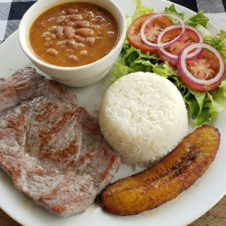 Carne asada acompañada de arroz blanco ensalada verde granos del día tajada madura