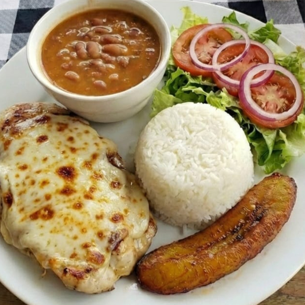 Pechuga asada con queso gratinado acompañada de arroz blanco granos ensalada tajada