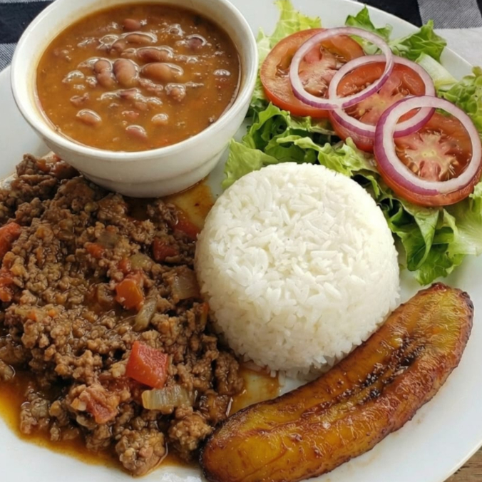 Carne molida acompañada de arroz blanco granos ensalada tajada madura jugo del día