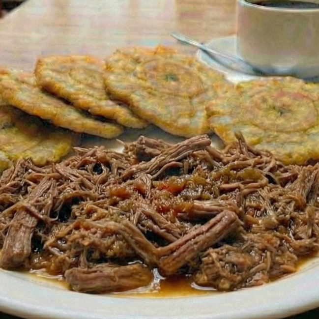 Carne desmechada acompañada de patacones