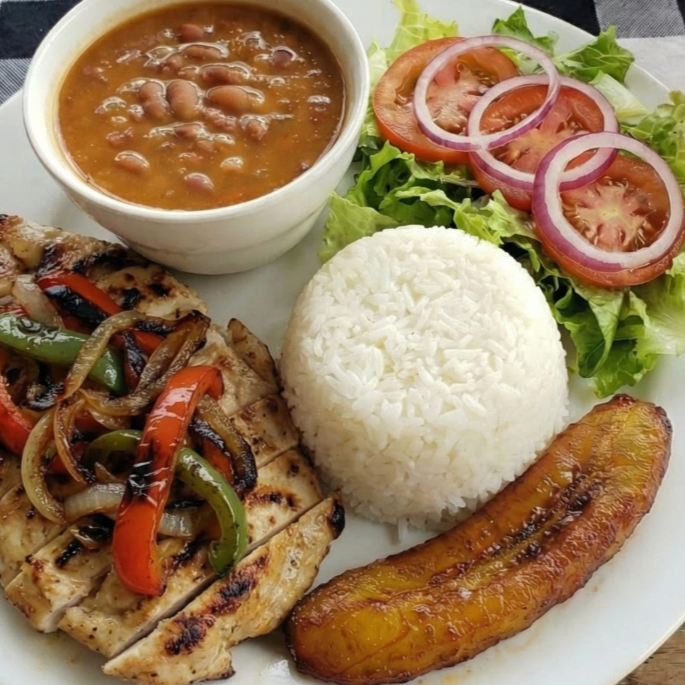 Pechuga grille acompañada de arroz blanco granos ensalada tajada madura jugo del día