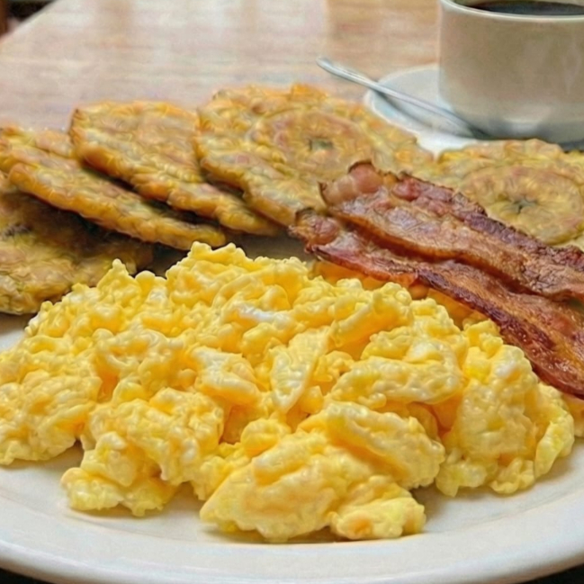 Huevos revueltos con tocineta acompañado de patacones
