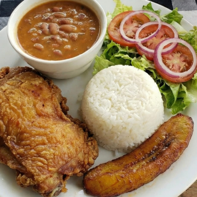 Pollo frito acompañada de arroz blanco granos ensalada tajada madura jugo del día