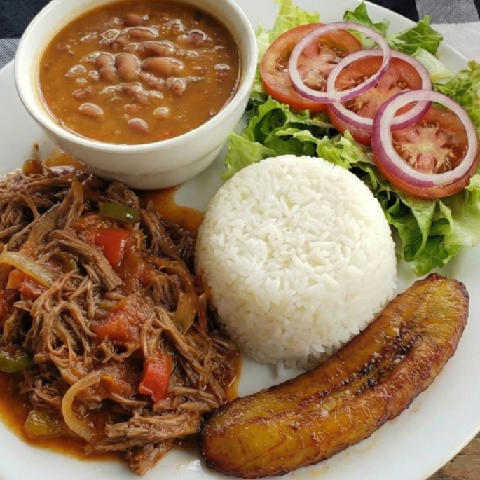Carne Desmechada acompañada de arroz blanco granos ensalada tajada madura jugo del día