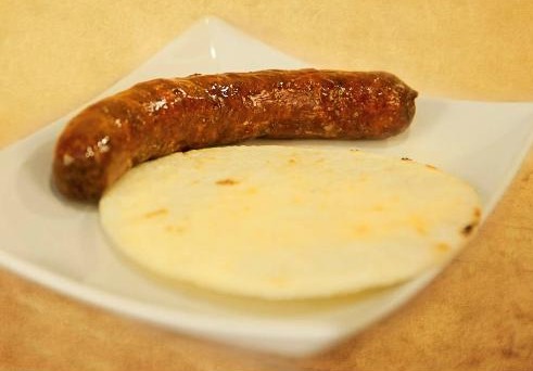 Chorizo artesanal de cerdo, acompañado con bollo salsas y limon.