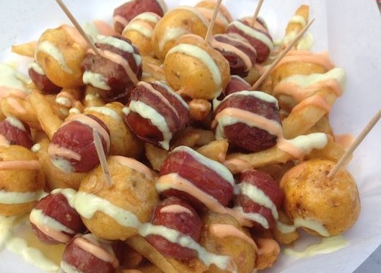 Papas criollas en casco con salchicha ranchera frita bañadas de salsa tartara y rosada.