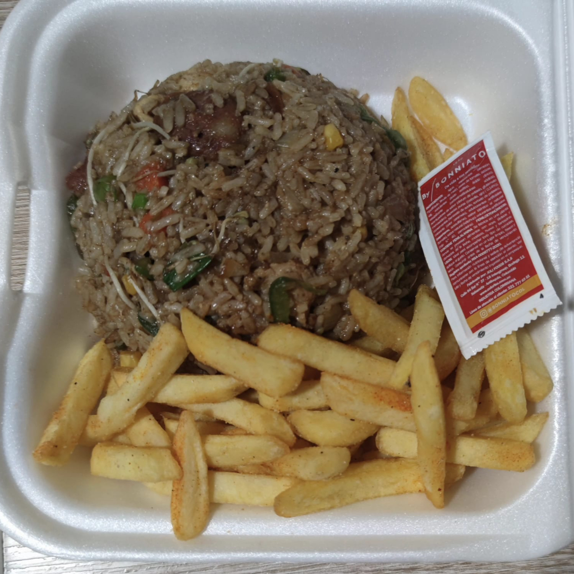 Arroz verduras salteadas, pollo, carne, cerdo y chorizo artesanal. Con papas francesa y gaseosa