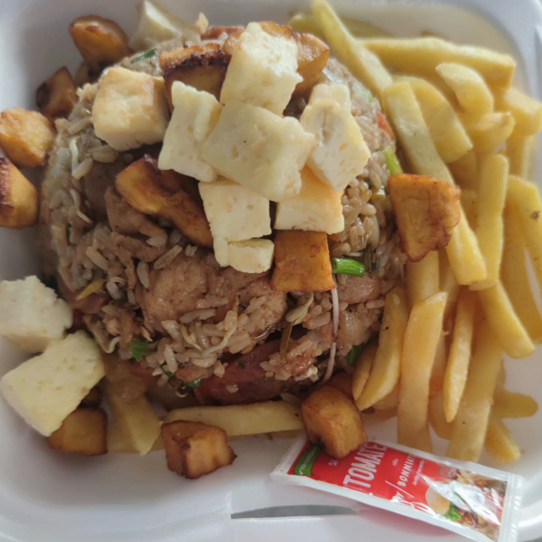 Arroz verduras salteadas, pollo, carne, cerdo, platano maduro en cubos y queso costeño frito y chorizo artesanal. Con papas francesa y gaseosa