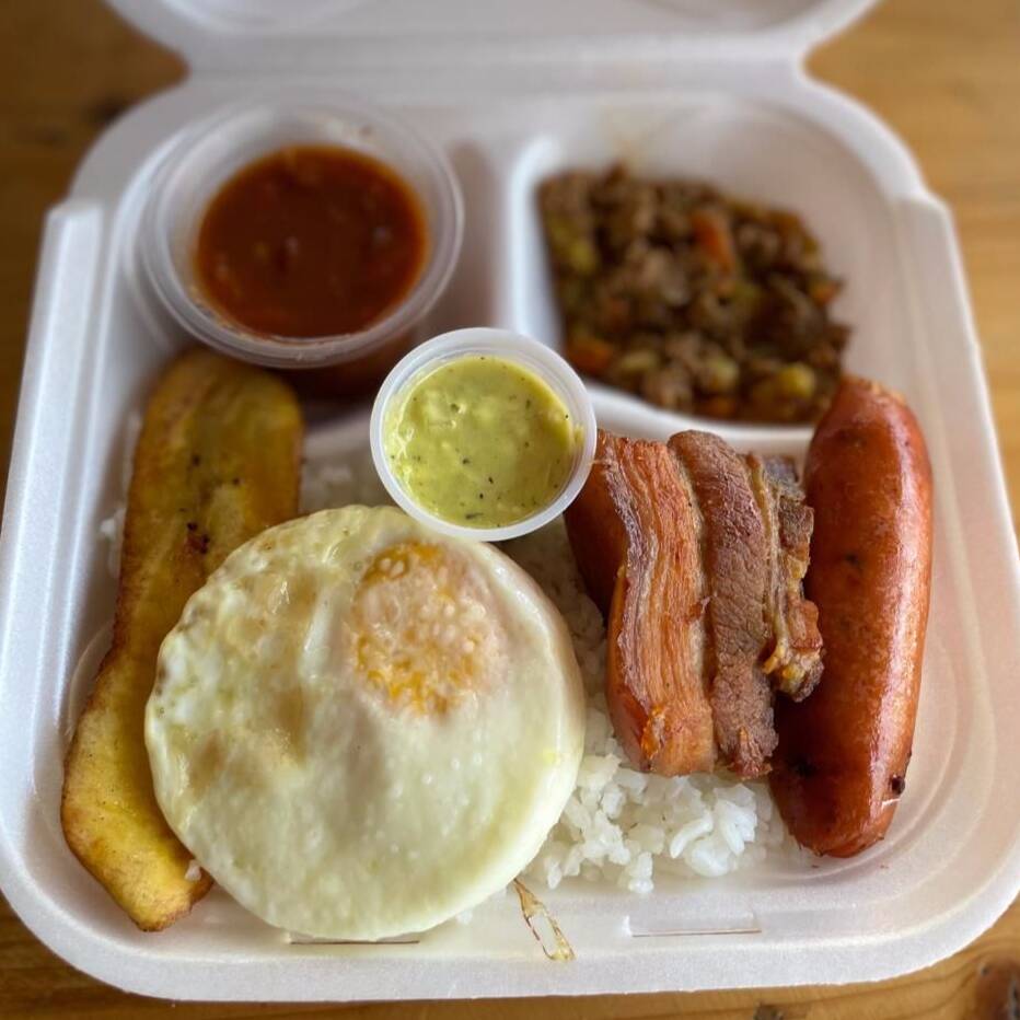 Carne molida, chicharron, chorizo, huevo, arroz, zaragoza y tajada madura, (sirve para 1 persona).