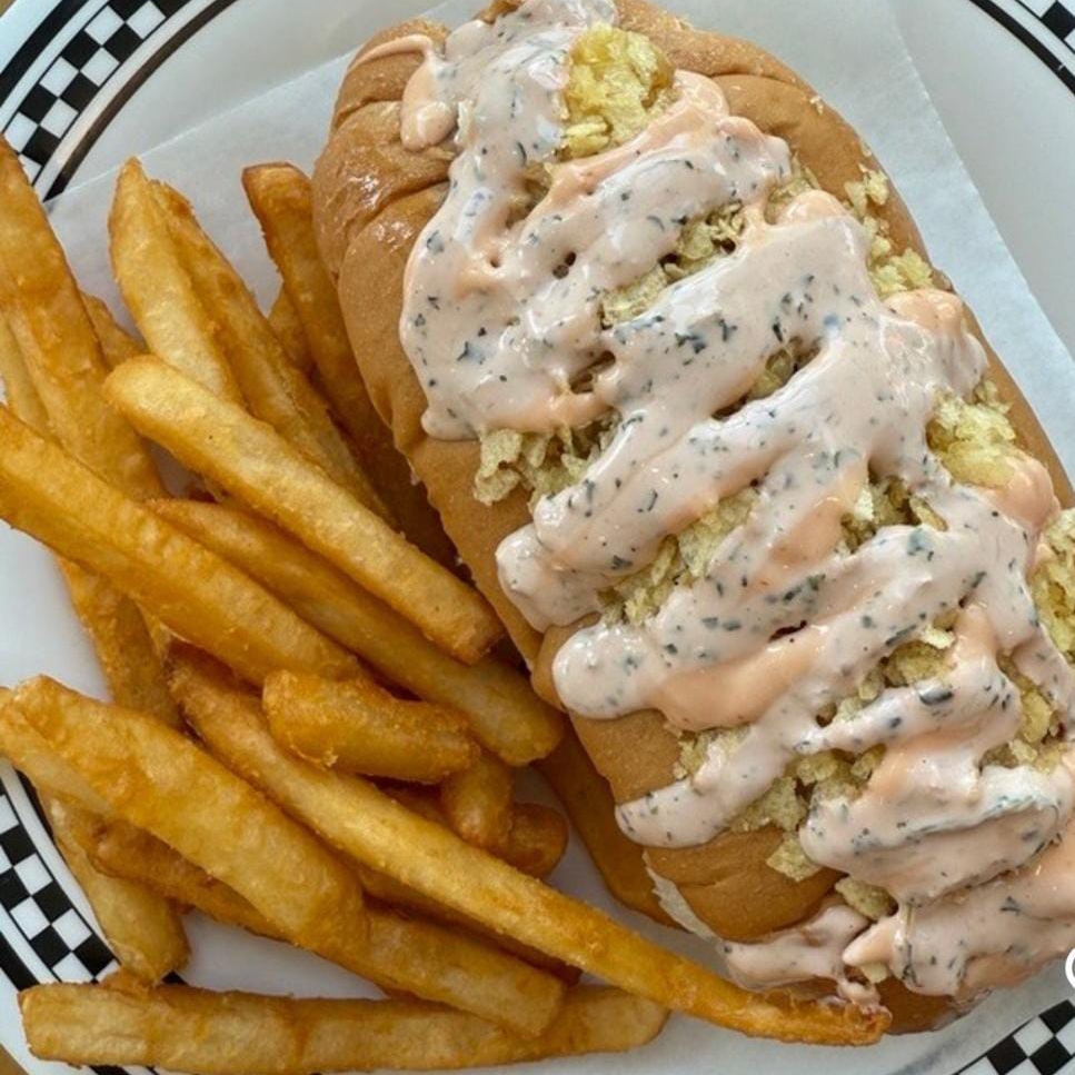 Pan de mantequilla, lechuga fresca,media salchicha suiza, papa chongo, queso costeño, mozarella, salsa tartara y piña.