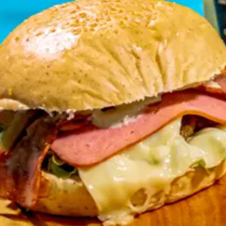 Pan de mantequilla, lechuga fresca, carne picada, pollo picado, papa chongo, queso costeño, mozarella, salsa tártara y piña.