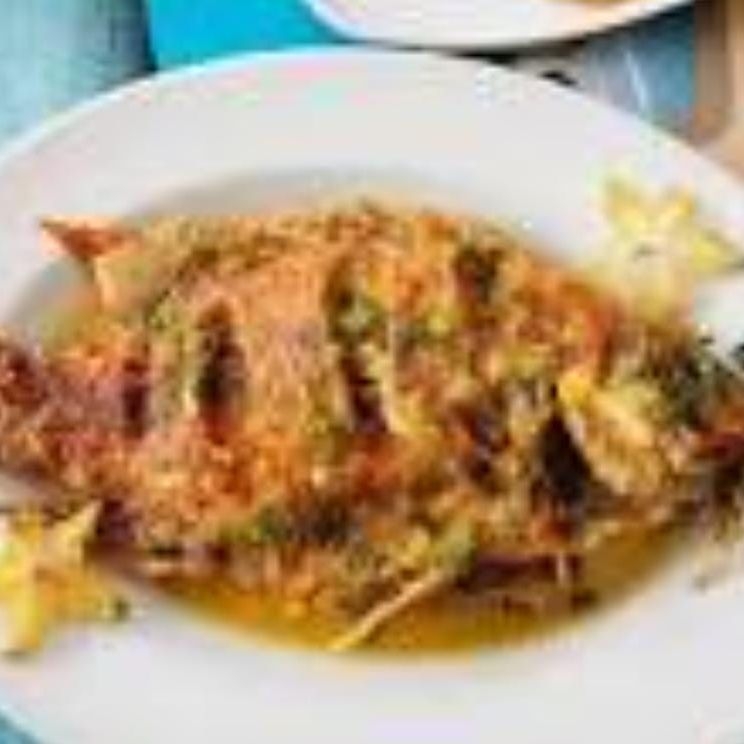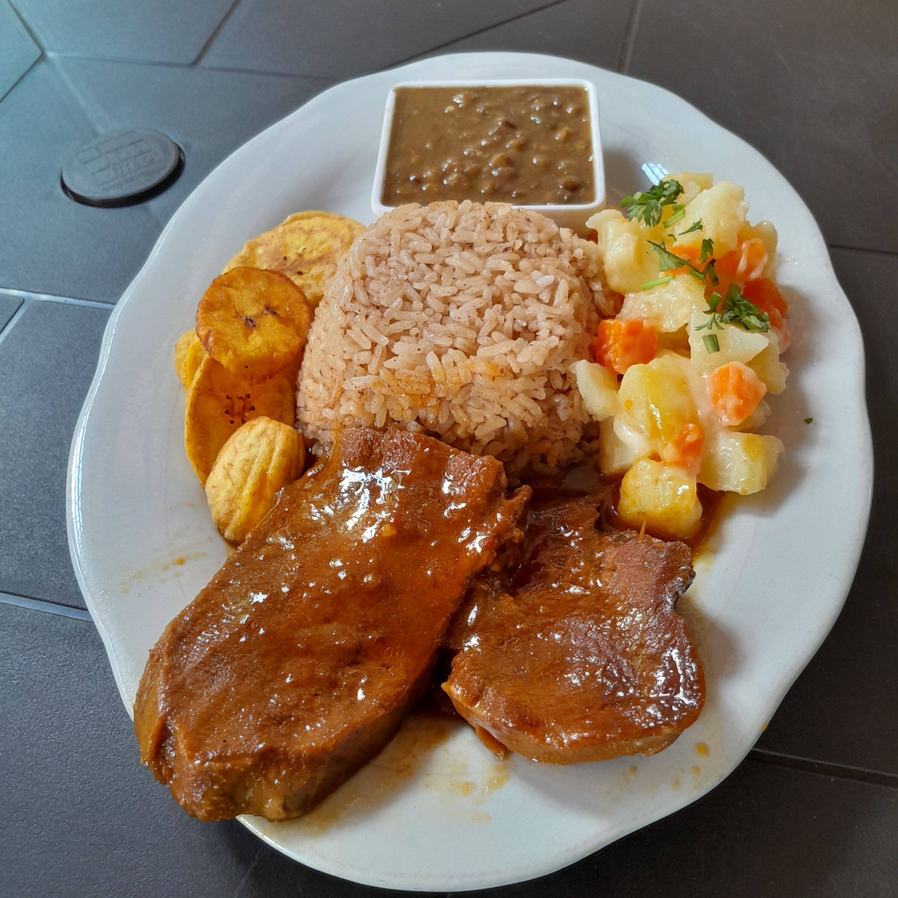 Acompañada con arroz con coco, ensalada, tajada de plátano, granos y sopa.