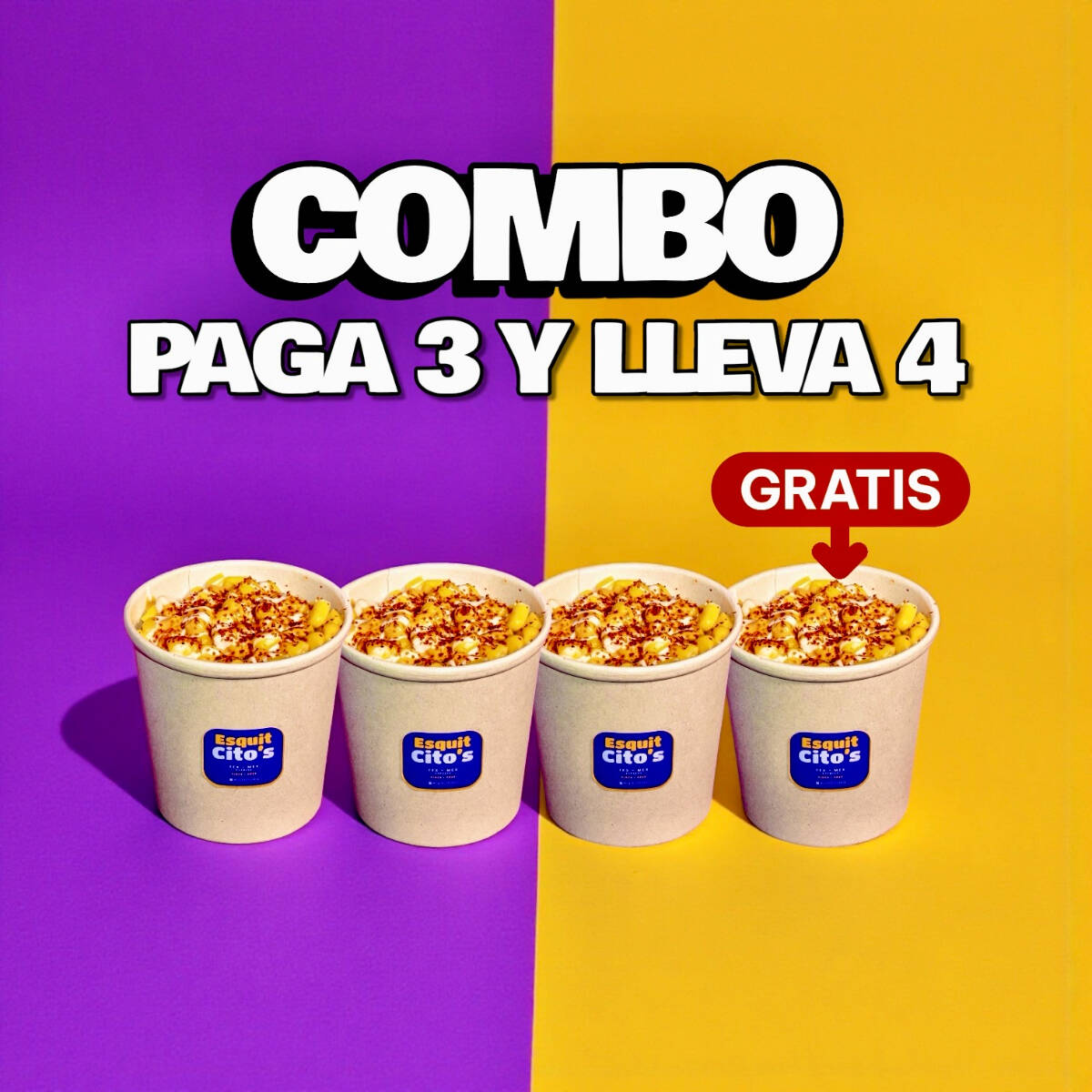 Paga 3 y lleva 4 esquites 12 oz, 1 de bacon, 1 de pollo parrilla, 1 de carne parrilla y 1 tradicional.