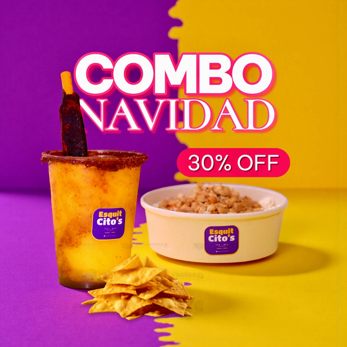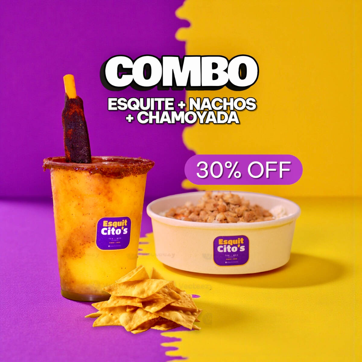 Combo esquite de pollo parrilla gratinado, nachos + chamoyada 16 oz, incluye banderin de tamarindo.